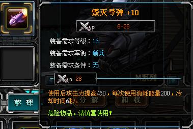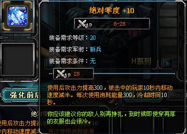 击中目标后会提升攻击力还可以使目标在规定时间内移动速度减半,升级后不会减少能量的小号和冷却时间,但是会提高攻击力和降低目标移动速度的时间。+1会增加50攻击力和1战力,+2会增加25攻击力和1战力,+3被击中玩家的移动速度减慢加2秒共6秒和+1战力,+4后属性无变化增加2战力,+5会增加75攻击力和2战力,+6会增加100攻击力、2秒移动速度减半及2战力。+7、+8属性均无变化只增加战力,+9时会增加2秒移动速度减半,+10后需要装备等级20级,总战力28,使用后攻击力提高300,被击中的玩家10秒内移动速度减半。