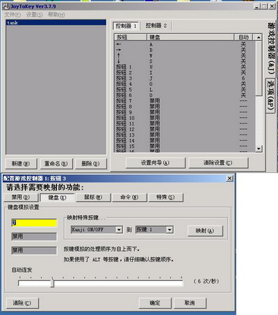 第四步、打开JoyToKey V3.7.9 汉化版,依照“设置向导”或者是直接双击打开方向或者键名数字进行对应键盘设定,我设定的手柄键3为对应J键,即炮弹发射键,需要对它进行一下自动开炮(点手柄该按钮不放,就一直自动开炮),注意图中的自动连发(我设置的是6,朋友们可以根据需要自行设置)