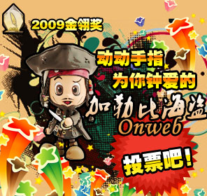 2009年金翎奖盛情开启,一年一度的游戏盛典即将再度拉开帷幕。由上海维趣出品的战争策略类网页游戏——《加勒比海盗onweb》也来势汹汹重磅亮相在金翎奖的评选活动中。此游戏以题材新颖、画面精致、情节丰富、游戏流畅等特点获得了全国5000万玩家的一致好评,在此次选评中势不可挡,独占鳌头。