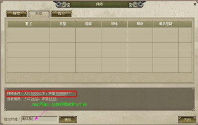 1、拜师条件:人口2000以下,声望10000以下即可拜师;