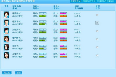 开始抢生意后会出现玩家自己的店铺员工列表页面,选择一名员工进行抢生意,在这里需要注意的是,员工能力值、经验越高,进行抢生意时抢到的人流量就越大,所以玩家在这部选择员工的时候尽量选择能力经验值都比较高的员工,这样可以为自己带来更大的利益。