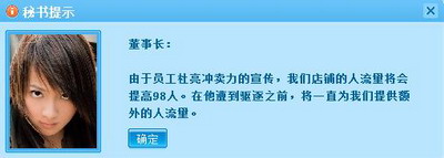 选择好员工点击抢生意,就正式进入抢生意阶段,这个时候秘书会提示此次抢生意的效果,如图4所示,在员工杜亮的抢生意之下,店铺人流量将会提高98人。