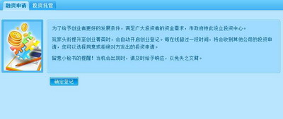 玩家进入《大富豪》城市地图中的投资中心可申请融资申请登记,凡是登记融资的玩家都可以得到其他玩家的投资请求。这样方面在资金上遇到困难的玩家也可以通过这种融资的方式获得其他玩家的投资,得到经济上的顺利发展。