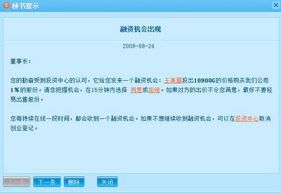 当其他玩家向你伸出投资的友谊之手时,就会收到秘书提示“融资机会出现”,秘书中会详细的介绍出对方玩家出资多少买你多少股份,需要在15分钟内作出答复,玩家可以选择同意或是拒绝来应对融资请求。