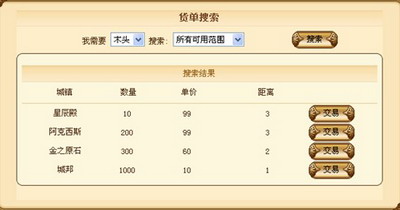 玩家在市场中选择我需要的资源进行搜索,在搜索出来的货单中,选择自己想要购买的,点击交易按钮,进行交易。