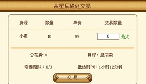 购买货物需要商队,每支商队的运输量是300单位,购买货物的量超过商队可以运输的量,则无法购买。交易成功后,玩家商队向卖方出发,商队出发状况在驿站查看。交易商队派出之后,无法撤回。商队到达卖方城市,开始装载购买的资源货物,驿站查看货物装载状况。交易商队装载货物过程中,无法取消装载。商队装载完成,返回玩家城市。商队返回状态在驿站之中查看。交易商队返回途中,无法撤回。商队交易完成,返回玩家城市,城镇顾问给出相应提示。