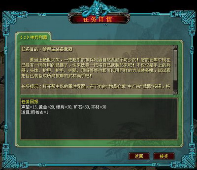 另外一种是合成或者拆分道具的任务,这样的任务一般需要用到几个道具,例如合成丹药需要药材,拆分武器需要武器,这些道具会在前一个任务的时候奖励给你,你拿到这些道具的时候,不要看他们没用就把他们卖掉或者先合成出道具,一定要接到任务以后,再去合成或者拆分,才能完成任务;