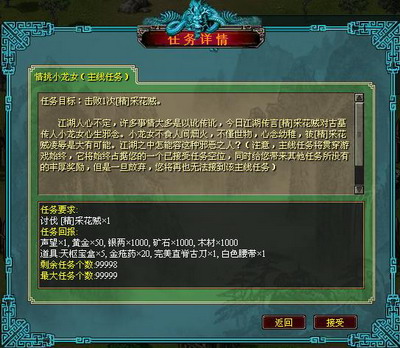 主线任务在游戏的第一个地图(西域)就必须要接,可以接一个,也可以接两个,其中接小龙女那个任务,奖励顶级武功比较多,接韦小宝的任务奖励装备比较多,同时接两个的话,会影响接其它悬赏和日常任务,主线任务的奖励非常好,一直做下去会有很多很好的奖励,还有神奇属性套装可以奖励,非常ok的哦!