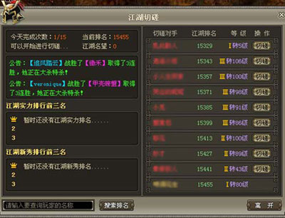 系统会根据玩家江湖威名的大小对参与切磋的玩家排名,在NPC“穆天衡”处还可以看到自己江湖排名之前的9位玩家,方便玩家树立目标,提高自己。江湖排名每10分钟刷新一次。参加江湖切搓以后,排名在你后十位的人可以向你发起挑战。