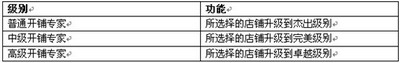 “开铺专家”道具一共有三个级别:普通开铺专家、中级开铺专家、高级开铺专家,而每个级别的道具对应的功能也不同。