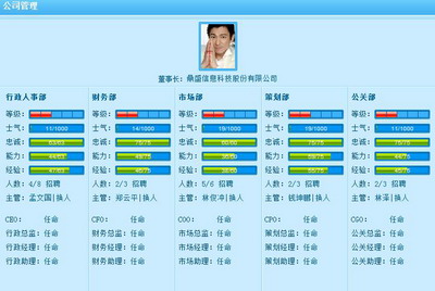 所以公司管理层职位的任命也直接关系到整个公司的运作情况,如果合理挑选任命,就成为董事长管理公司中一件至关重要的大事。在挑选部门管理层员工的时候,玩家需要尽量多参照员工的人品、忠诚度、能力、等级等属性值,这些属性值越高表明这名员工越优秀,安排部门职位的可能性就越大,对公司带来的效益也越大。