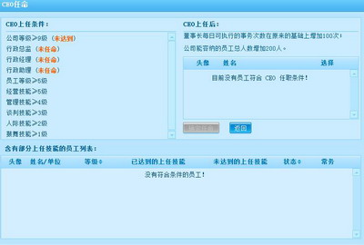 最终决定该员工是否能胜任该职位的条件不仅仅只是属性值才是唯一的参考条件,部门员工技能也是至关重要的一点,例如图2中公司行政部门CEO任命条件,对该员工的等级,经营、管理、谈判、人际等技能都有着严格的要求,所以玩家在培养的公司高层管理员工的时候也需要注重培养他们的技能。