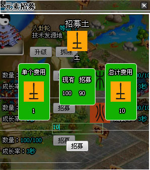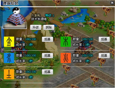 玩家可通过天书中的八卦轮来招募元素。进入天书后,点击八卦轮打开八卦轮界面,选择想要招募的元素,输入想要招募的数量,点击确定即可招募成功。已有的各种元素总数量不可超过天书人口上限。