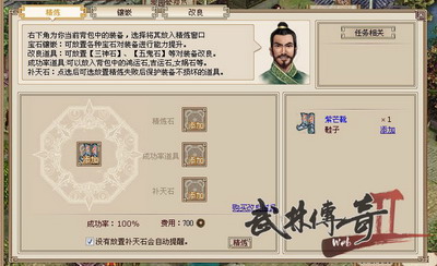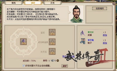 网页游戏是一个美丽的虚拟世界,网页游戏的精彩之处,就在于是一个高度仿真的虚拟世界,在这个世界里,模拟现实的仿真社会也好,还是现实生活中无法实现的快意恩仇也好,都是玩家们喜爱网页游戏的理由。2009年**旗下最精美制作与创意角色扮演RPG网页游戏《武林传奇2》。除了拥有让人热血沸腾的擂台系统,还有更多的创新系统在维系整个游戏的成长,其中极具特色的装备镶嵌系统,能够让所有玩家们大过一把镶嵌瘾。