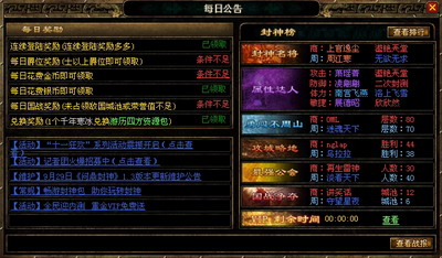 在“公告”界面中点击“领取”,系统就会为你发放奖励,而且连续登陆奖励更丰厚哦!此外,当你完成游戏中的特殊事件时,也可以在“公告”中领取奖励!比如:当你到达“士”以上爵位时每日可领取奖励(获得爵位需要荣誉值,而参加国战可以获得大量荣誉值);每日花费金币、银币也可以领取奖励;而每日国战奖励,就需要在国战中占领敌国城池,或者荣誉值达到一定数值才可领取;当你挑战不周山时,每层都会随机掉落“千年寒冰”,当你收集一定数量的“千年寒冰”后也可以在“公告”领取奖励哦!