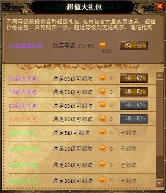 此外,你还可以点击人物头像右边的“礼包”来免费领取众多超值奖励!《问鼎封神》为游戏中不同等级段的玩家提供各种超级礼包,包内包含大量实用道具,只要你满足相对应的等级就可以免费领取!而且每个等级阶段还有特殊的超值大礼包供玩家购买,丰富的内容(把鼠标放到礼包名称上就可以看到礼包的内容哦!),超值的价格,只可购买一次,超过等级则无法购买,速速来抢购吧!