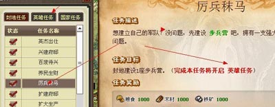 从第4步开始,在进行以上建设的同时可以同步作英雄任务和国家任务,其中要求去**的任务你拿系统奖励的10个轻步就能完成(但是建议最好还是等出了至少1个步兵以后再去完成,因为按照7,4这样的顺序排阵,可以杀两个土匪,而10个步兵则只能杀一个),虽然不能杀死所有土匪,但也算完成任务。练级的话,等你存够了44个轻步兵、15个弓箭手再去,并且按“前锋7步、前军4步、中军15弓、后军7步、后勤26步”排列你的军力,就可以一轮内消灭所有小股土匪。而且这些出的兵,可以跟着别人的大部队一起去打下90城,记住这是一个讲究集体力量的游戏,你一个人再NB,也无法跟一个国家抗衡。这第一个封地随着游戏进程将逐步拆除林、农、矿、兵营等建筑,改建家民户,最终变成1英雄府15民户的纯钱庄。