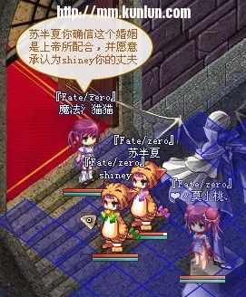 随后婚礼的主角——我们的这对新人入场(SS和苏苏)!!众人排成男左女右、人妖站中间的队形迎接新人入场!!~~……