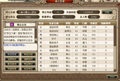 在新的帮会系统中,帮会的界面进行了调整,增加了帮会友盟和敌盟关系设置功能,增加帮会仓库,玩家可以捐献银两,银两用于据点战竞标,另外还调整了帮会的创建功能。