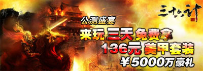 2009年10月10日14时《三十六计》双线6区火爆开启,诸多精美活动等待玩家体验,各类实物奖品价值累计达千万元。妲已、媚娘、关羽、霍去病……传奇武将招之即来!“万人国战”场场精彩!更有精致活动,海量奖品相送!