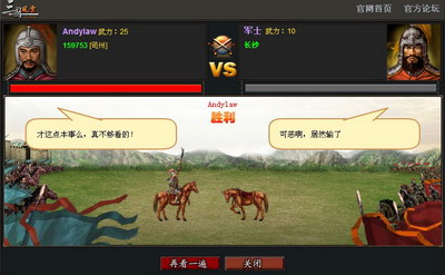 “乱世争雄”还新增了充满趣味性的可视化的武将单挑过程演示动画,玩家在接到传统的文字型战报的同时可以自由地选择是否观看动画。动画与文字战报完全同步,整个战斗过程中的每一个回合都会表现在战斗中。别说网页游戏没有画面,这就是网页游戏的新亮点!