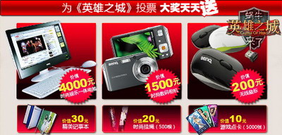 此外,凡参与短信投票的朋友即可获得游戏道具卡一张(100%中奖),更有机会赢取一体电脑、数码相机、无线鼠标等众多大礼哦!
