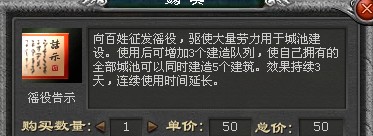 徭役告示:被玩家授予商城至宝,VIP之王等称号的宝物。作用是将所有麾下城市的建筑队列在3天内提升至5个(原始状态为2个)。可以将玩家的发展速度提升2.5倍的超级宝物。