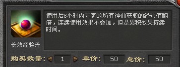 长效经验丹:由上古仙灵所制可以提升神仙的灵智。使之能在长时间内获得的经验双倍累计。