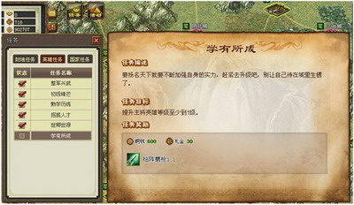 创建角色昵称、选择国家,进入游戏。是不是不知道接下来该做什么?别担心,《三十六计》专门在任务栏目里为新人玩家设置了封地任务、英雄任务、国家任务等一系列新手发展任务,引导新人快速掌握游戏玩法技巧。不仅每个任务详细描述了完成的具体方法,还在任务完成之后,给予丰厚的奖励,这些奖励足以让玩家在初期的发展里衣食无忧。