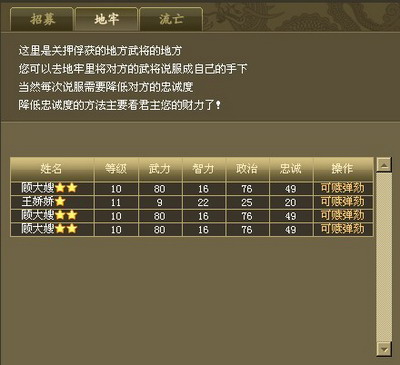 没错,只要您去攻打拥有史实武将的玩家根据地,通过战斗击败对方,就有一定概率俘获对方的战斗武将。抓获回来的武将将被关在您的地牢之中。或用金钱或耗时间,对方被俘将领的忠诚值便会直线下降,不久之后,您只要晓之以情、动之以理,完全可以将其收入帐下为己所用!