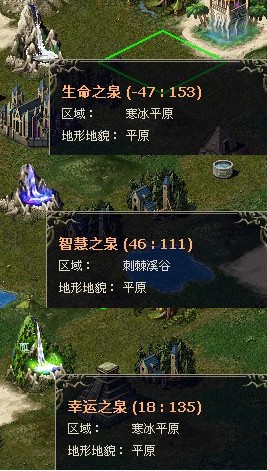 魔法泉水分为生命、智慧和幸运三种,英雄访问后分别可以获得一定时间的军队生命值、