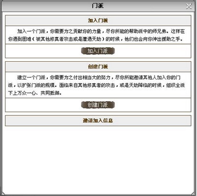 也可以在游戏上面的“门派”栏里,点击“加入门派”,然后游戏里所有的门派都会出现了。这一点基本上所有游戏都是大同小异的。选择一个,然后申请加入。