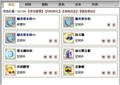 第二步,兑换好物品后,你需要去背包-法宝页面进行装备。点击“装”便可全部装备上身咯!
