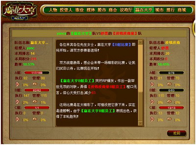 在“赢在大亨挑战赛”里, 基本规则是:员工的属性里面有“执行”、“管理”、“信心”,比赛的时候,员工的执行就是攻击力,管理就是防御力,而信心相当于血量。在比赛中,哪一方的信心先为0时,则比赛落败。