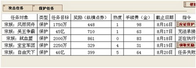 任何人都可以支付一定的悬赏,对一个具体的针对指定玩家的攻击任务发起一个对应的保护任务,请人保护该攻击任务的被攻击对象,避免其受到损失。当攻击任务到期,攻击方给被攻击方(即受保护方)所造成的损失小于攻击任务所要达到目标的50%,则保护任务就成功了,所有参与保护的玩家都可以获得悬赏。
