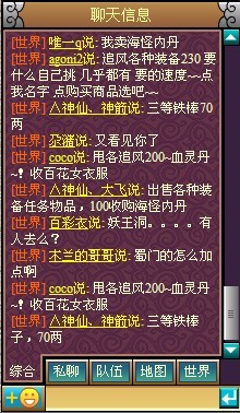 《仙域》的聊天发言分私聊、世界、公共、队伍和帮派等几大模块,玩家点击对话框前的选项即可选定发言频道。路上遇到其他玩家时,可直接点击对方,弹出私聊选项即可私下里聊天。为了处理不同频道的聊天内容,《仙域》提供了聊天分频功能,同一个频道的聊天内容可以集中在一起显示,这由玩家来选定,是不是很体贴?