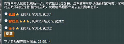 馆驿中每天随机刷新3名历史武将一次。(使用招募令,可继续刷新可招募武将)