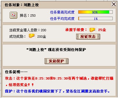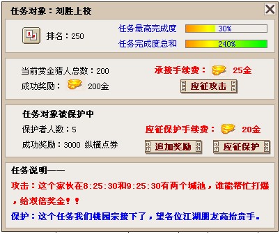 3:发布任务的手续费和支付的悬赏都是用金来结算,完成攻击任务获得的悬赏也是金,完成保护任务获得的悬赏则是纵横点券!