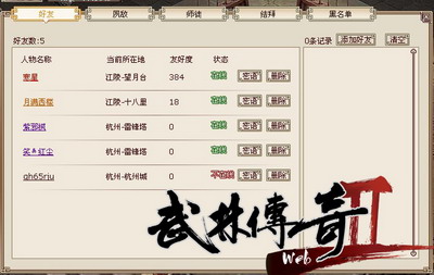 得人恩果千年记,得人花带万年香。就让人际系统,帮你记录《武林传奇2》世界的旅程点点滴滴,在这个险恶的江湖中,赐予你一双明辨是非的双眼吧!