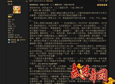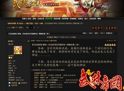 前段时间播放一个连续剧《我的兄弟叫顺溜》,里面有个着名的台词“:晴空一声霹雳响,诞生英雄陈营长!”这几天我一直关注着《武林帝国》论坛日记版里面的一篇《神话》,因为当笔者看完《神话》的第一段内容后,笔者我马上想到“:晴空一声霹雳响,诞生文豪孟叶落!”