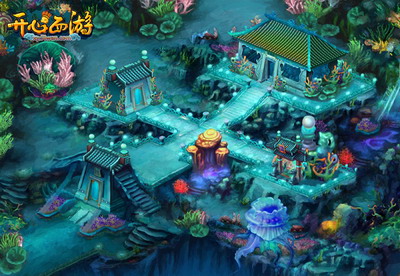 碧海深渊,龙宫气象,宝石蓝色的海水泛着灵动的波澜,神秘优雅的海底仿佛蓝水晶球中的世界。《开心西游》中的龙宫呈现出一派精致唯美的气象,高贵的珊瑚礁波中轻摇,温润的珍珠巧放灵光,海底之城的宫殿也是气势磅礴,看那座琉璃瓦打造的殿堂就是传说中龙王的居所。龙宫是西游神话中不可缺少的场景,在《开心西游》的世界里龙宫将成为玩家历练的好去处,齐天大圣的定海神针或许会收入您的行囊!