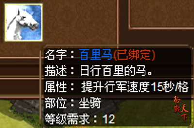 百里马,战国时期培育的优良战斗种马,能日行百里而大气不喘,强将必备哦,可以提升行军速度15秒/格。
