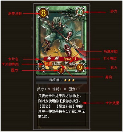 表示战斗中武将卡片的强度。战斗阶段中武将之间交手时,武力的数值将决定胜负。因此,武力数值越高,战斗将越有利。