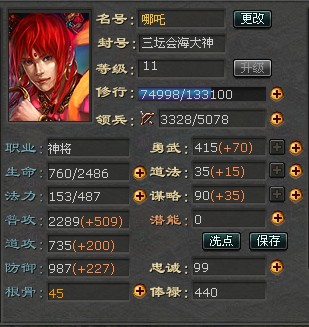图中就是经过飞升的哪吒,可以看出虽然只有11级,但是由于有了飞升时遗留下来的200多点的潜能作为补充,飞升后的哪吒已经有了和60级左右的神仙对焊的实力。而且此时哪吒的带兵数也基本达到了60级神仙的带兵数。也就是说,飞升后的神仙可以作为即战力,立刻投入战斗。