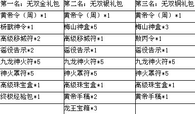 新服玩家冲级赛:截止至规定时间,排名前三的玩家获得无双礼包