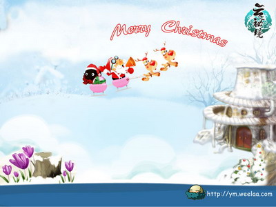 圣诞老人手里拿着的是云之秘境的世界频道喊话道具小喇叭,贱贱表情的咯咕兽像被法师的雷暴术劈中了一样脸色发黑,左下角的雪地里还开着紫罗兰,两只驯鹿表情无奈又郁闷地拉着雪橇奔向云之秘境的新手村客栈……中式武侠的细节无处不在,可是云层上却又明明白白地出现圣诞老人的喊话:Merry Christmas!云之秘境的口号是:恶搞无罪,囧囧更健康!