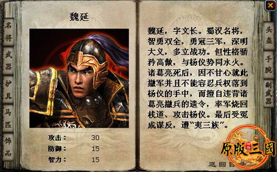 《原版三国》中的兵器谱不仅仅是为你介绍武器方面的知识,同时他也是你招贤纳士的一本依据!魏延、张绣、文丑、颜良……等三国著名将领都被收集到兵器普通,同时还介绍了每位将领的资料、特点和事迹,为玩家求贤的道路上助一臂之力,也为玩家一统天下打下良好的基础!