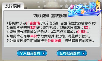 进入个人投资影片,就可以证实拉着对方上谈判桌啦,电影能卖多少钱,还要看你的表演了!如果表现出色,那这部影片会很受他们的欢迎青睐,价格随之暴涨,不过如果失败了,那今天就只能回家继续练习了,一部电影每天只能谈判一次哦!如果实在卖不出去,那就到“娱乐公司”去吧,看看哪个公司老板能看中你的大片,也会收购的哦!