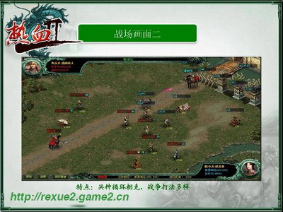《热血2》首先在画面上突破了以往策略类游戏,《热血2》以更柔和更斑斓的色调描绘出了一幅大好河山。不仅如此,《热血2》还一改了以往三国策略类游戏呆板的战斗画面,而是以FLASH再现的形式,活生生的让您的将军骑着高头大马,率领千军万马在阵前与人厮杀,而效果也将以更逼真的形式出现。