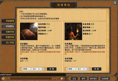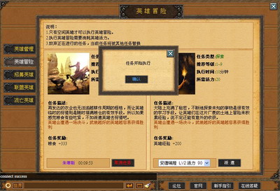 在酒馆里,每天都会进出各种族的英雄,雇佣他们为你冲锋陷阵,平定天下。玩家可以为自己心爱的英雄装备多种武器和防具,为他们赐名,打造成个人专属的超级英雄。同时,英雄可以通过多种途径来等获得经验以提升等级,从而变得更加强大。现在,玩家可以选择自己城市中的“酒馆”,选择“英雄冒险”即可开启这段奇妙的旅程。当然,值得注意的是,只有空闲的英雄才可以执行此任务,同时每次冒险还将消耗20点英雄活力值。